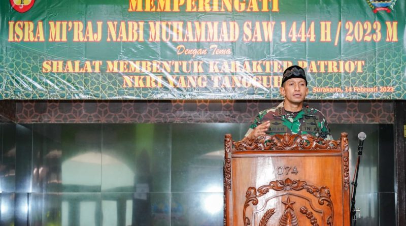Surakarta – Korem 074/Warastratama menggelar pembinaan rohani dalam rangka peringatan Isra’ Mi’raj Nabi Muhammad SAW 1444 H/2023 M dengan tema “Shalat Membentuk Karakter Patriot NKRI Yang Tangguh”, bertempat di Masjid Sapta Marga Korem 074/Warastratama, Selasa (14/02/2023).